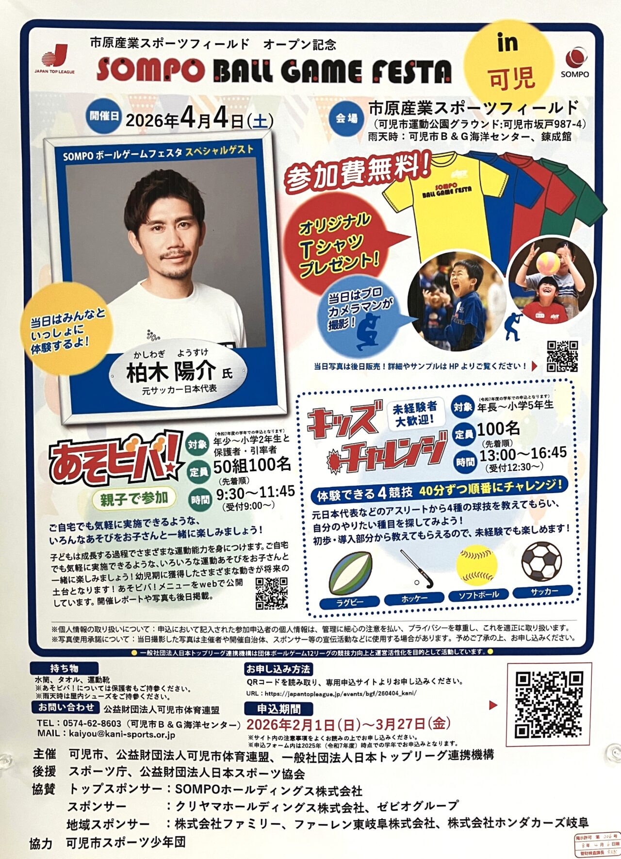オープニングでは、セレモニーのあとに「SOMPOボールゲームフェスタ」と「スポーツマルシェ」が同時開催されます。当日はスペシャルゲストとして、元日本代表で、先日引退試合を行った FC岐阜アンバサダーの柏木陽介さん が来場予定です。