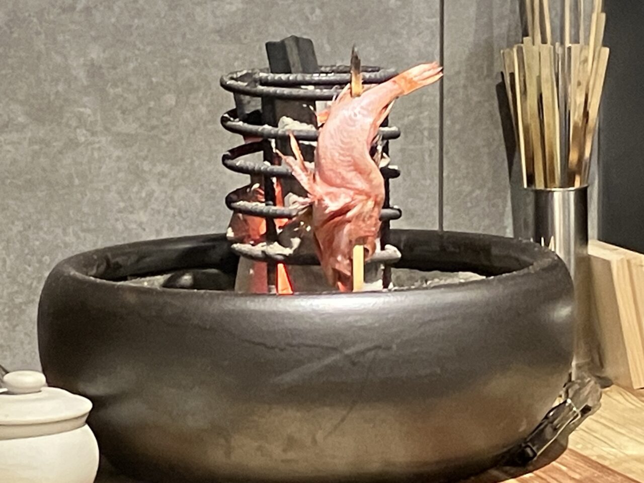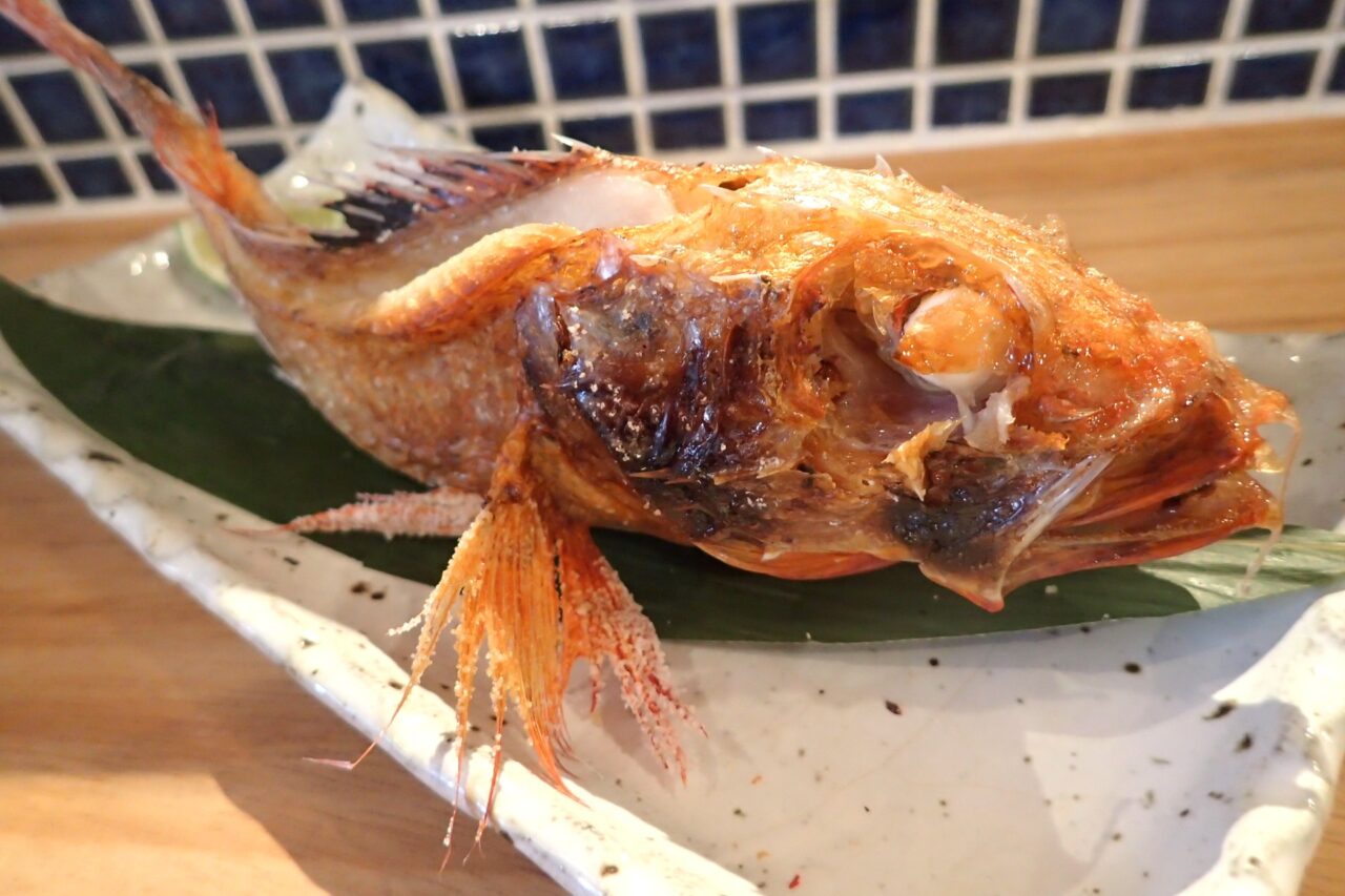 じっくりと時間をかけて炭火で焼き上げられる「キンキの原始焼き」は、外はパリッと、中はふわふわでやわらかく仕上がっています。